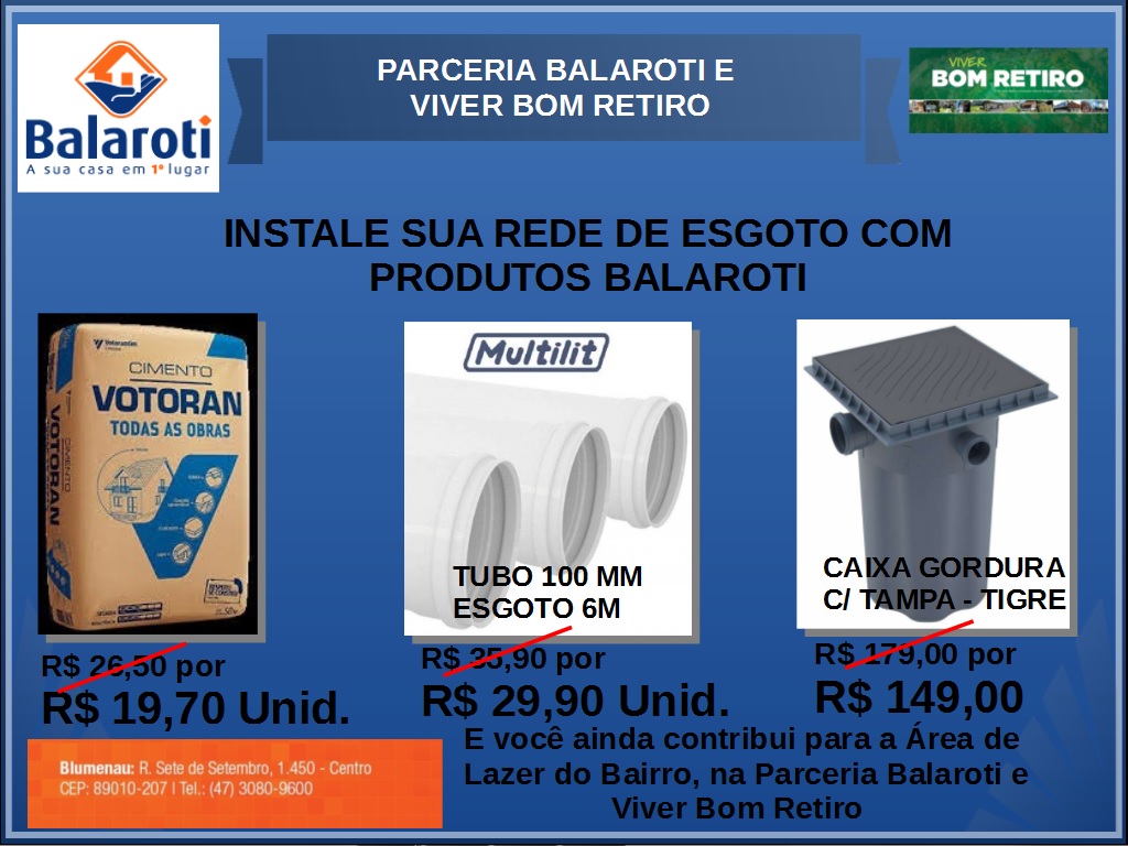 Numa iniciativa pioneira do VIVER BOM RETIRO, exclusiva para moradores, empresas e condomínios do bairro, a Balaroti Materiais de Construção, oferece preços especiais na compra de produtos utilizados na instalação da rede interna de esgoto.