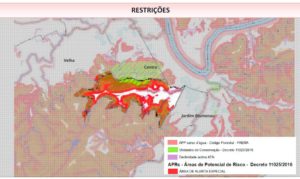 No mapa, na cor vermelha, observamos a demarcação das chamadas “Áreas Ocupadas de Alto Risco”. A área marrom é sem ocupação, mas igualmente apontada como de alto risco. Eles são classificados como de alto, médio ou baixo risco. Com esse novo critério adotado pela Prefeitura, todo projeto encaminhado passa antes pela análise da geologia.