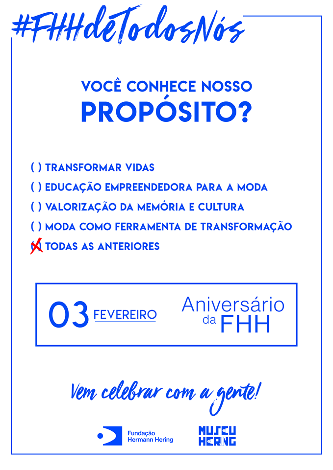 É celebrando esse novo tempo que a FHH chega aos seus 83 anos. Compreendendo a importância da memória para construir futuros mais possíveis, abraçando a vocação de formar e capacitando, sempre com um olhar empreendedor e acreditando na moda como plataforma de transformação, a Fundação Hermann Hering comemora mais um aniversário com atividades e números que ilustram o impacto positivo de suas ações.