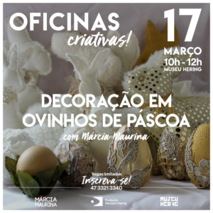 A Páscoa está chegando e com ela o período de cultivar a tradição milenar dos ovinhos recheados com amendoins e outras guloseimas. O Museu Hering vai dar uma forcinha para despertar sua criatividade. Neste sábado, dia 17, o espaço cultural promove uma oficina de decoração. Será das 10 ao meio-dia.