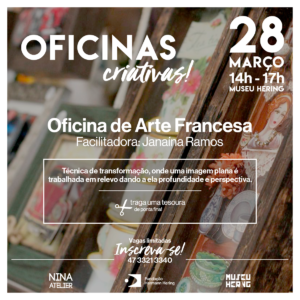 A Fundação Hermann Hering realiza nesta quarta-feira, 28 de março, mais uma oficina. Desta vez ensinando uma técnica de artesanato francês, ministrada pela artesã Janaína Ramos. A aula começa às 18 horas, com término previsto para 21 horas.