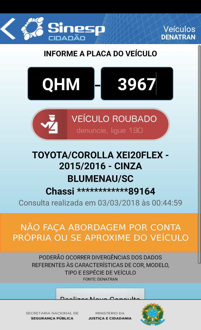 Por volta das 23 horas, os moradores consultaram a placa do carro por meio do aplicativo Sinesp Cidadão, onde constataram se tratar de um veículo roubado. Imediatamente, acionaram o telefone 190 e uma viatura da PM veio ao local. O proprietário foi localizado na manhã seguinte.