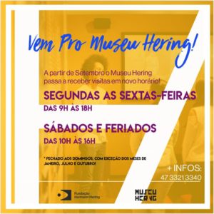 O Museu Hering terá novos horários de atendimento a partir de setembro. A mudança de deu após ouvir inúmeros visitantes ao longo dos seus oito anos de existência, permitindo assim abranger um público ainda maior.
