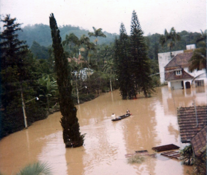 Nesses quase 60 anos de residência no bairro, conviveram com pelo menos 26 enchentes. As de 83 e 84 foram as que causaram mais prejuízos ao patrimônio da Famila Koffke. As águas chegaram ao forro da casa, onde haviam colocado peças menores. Foram obrigados a se alojar onde hoje funciona a Wizard. Foram 10 dias alojados por lá no ano de 83.