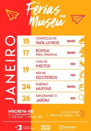 O Museu Hering preparou uma programação especial de férias para a garotada. Ela será desenvolvida durante todo mês de janeiro, a partir do dia 15, terça-feira. Serão oficinas sustentáveis, de culinária, entre outras, onde as crianças aproveitarão seu período de folga se divertindo e aprendendo.