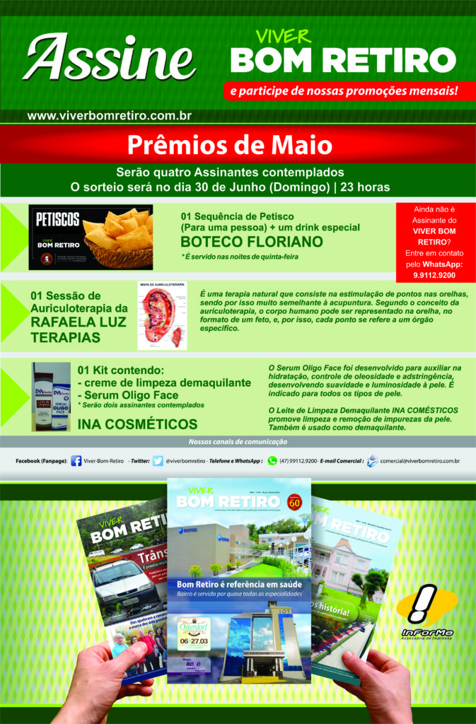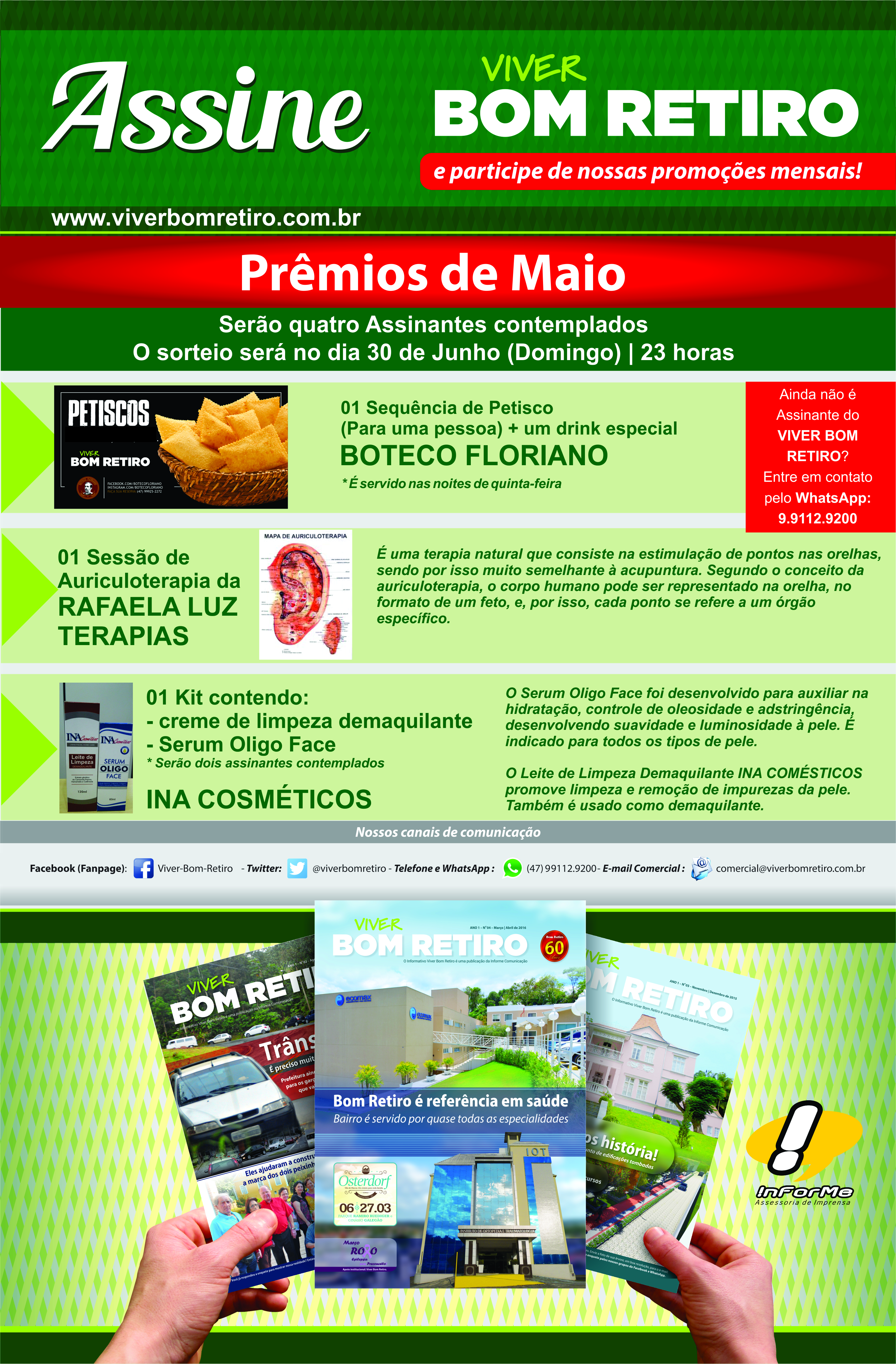 Ainda não é Assinante do VIVER BOM RETIRO e gostaria de concorrer aos prêmios mensais? Ainda dá tempo. Entre em contato com a gente pelo whatsApp!