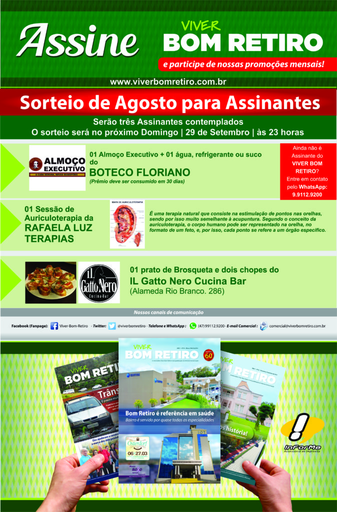 Atenção Assinantes do VIVER BOM RETIRO: Confira os prêmios de agosto! O sorteio será neste domingo, dia 29 de setembro, às 23 horas.