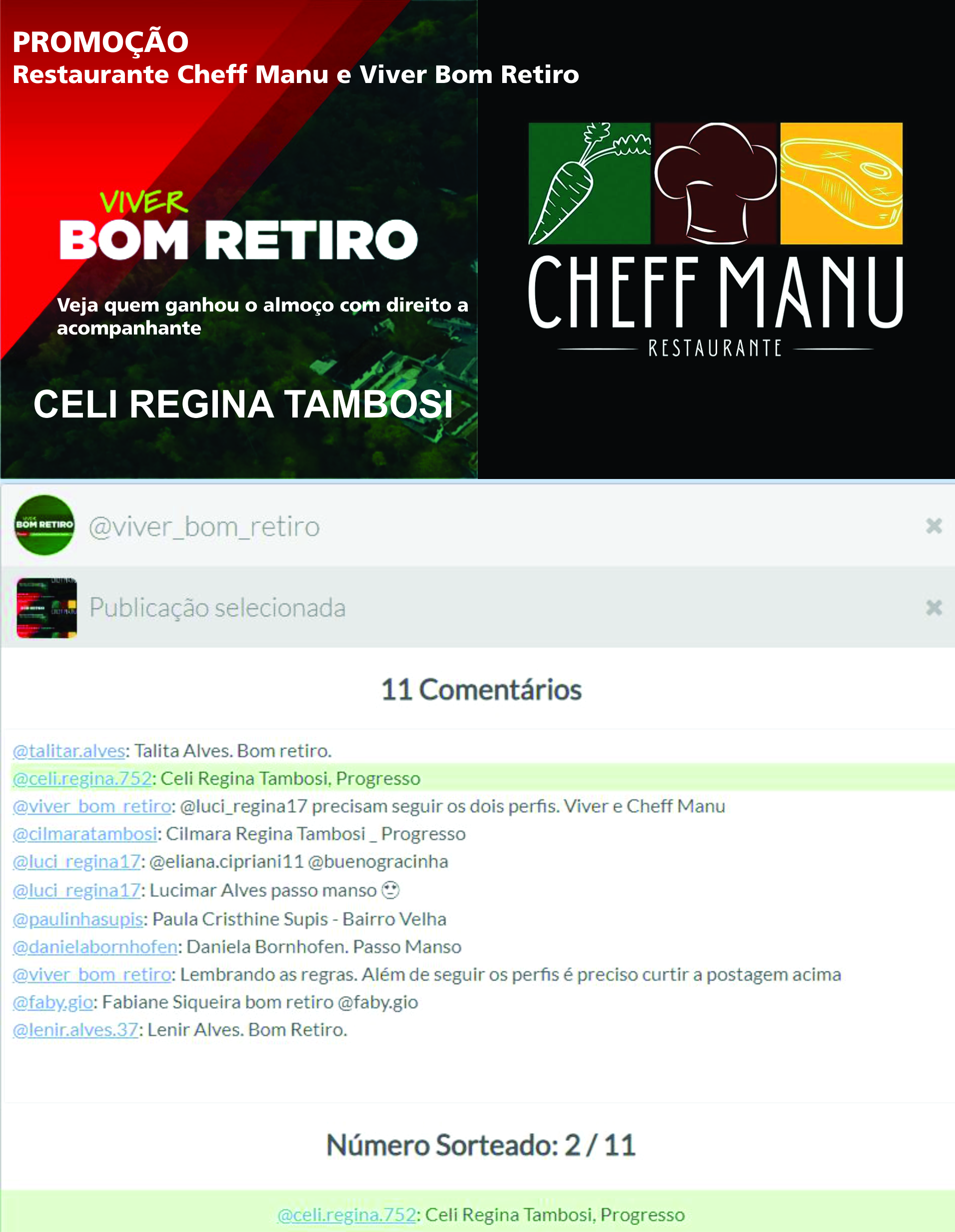 Parabéns para a Celi Regina Tambosi, ex-moradora do bairro! ela ganhou o almoço com direito a acompanhante no Restaurante Cheff Manu, na promoção feita no Instagram.