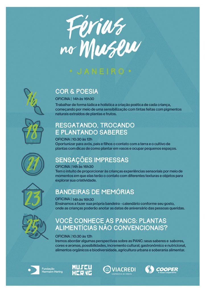 Como já é tradição, em janeiro o MUSEU HERING conta com uma extensa programação em seu FÉRIAS NO MUSEU. Neste ano, serão realizadas cinco oficinas, até o próximo dia 25. E o melhor: totalmente gratuitas.