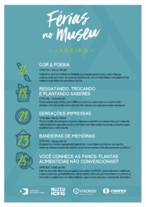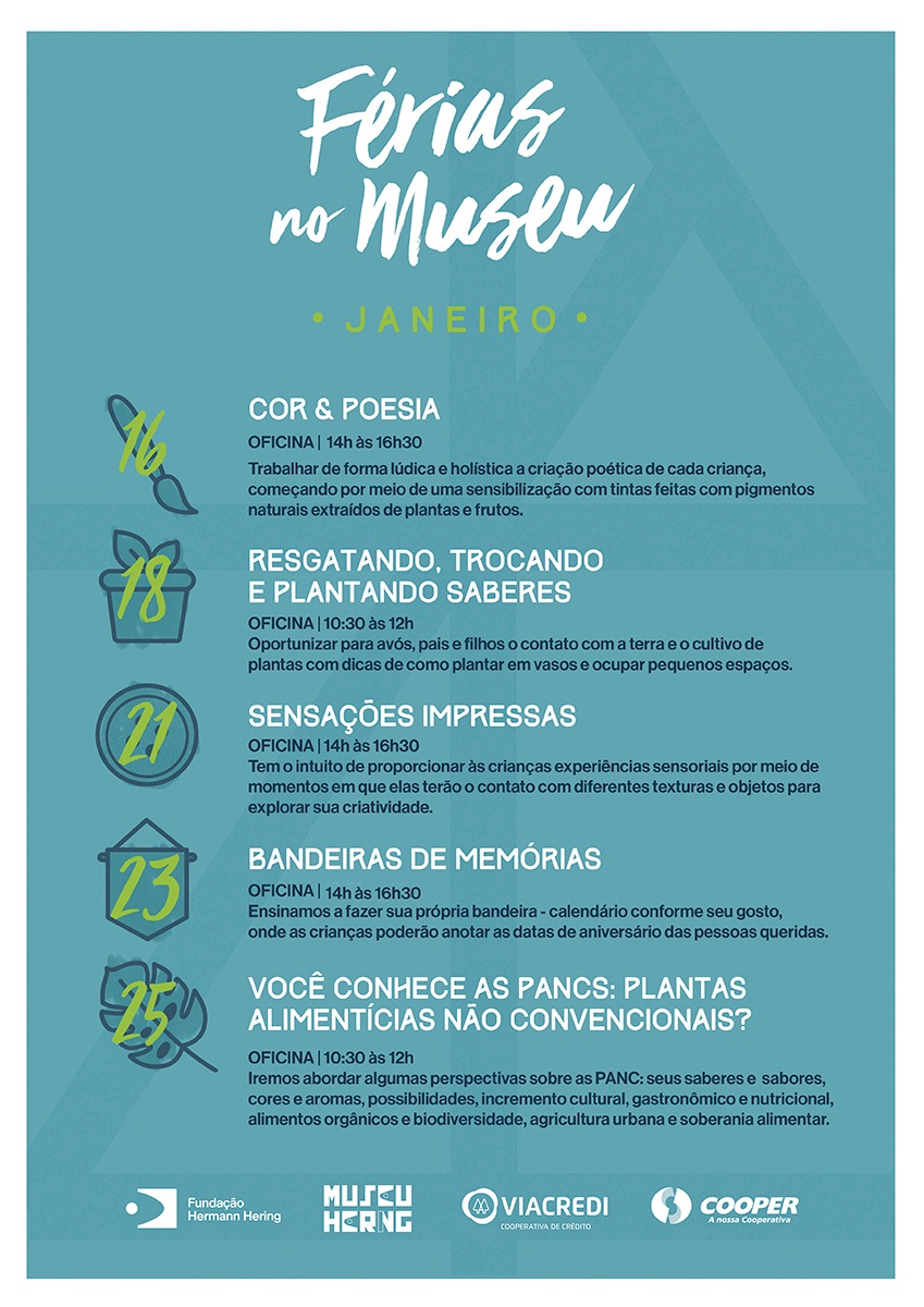 Neste sábado, 18 de janeiro, ocorrerá a segunda oficina da programação do FÉRIAS NO MUSEU, realizada pelo MUSEU HERING. Com o tema: Resgatando, trocando e Plantando Saberes, ela propiciará o contato com a terra e o cultivo de plantas. Teremos uma hora e meia de atividades, das 10h30 ao meio-dia. Podem participar crianças a partir de qualquer idade, junto com pais e avós. A oficina é gratuita, mas as inscrições devem ser feitas antecipadamente no link mencionado no final desta reportagem.