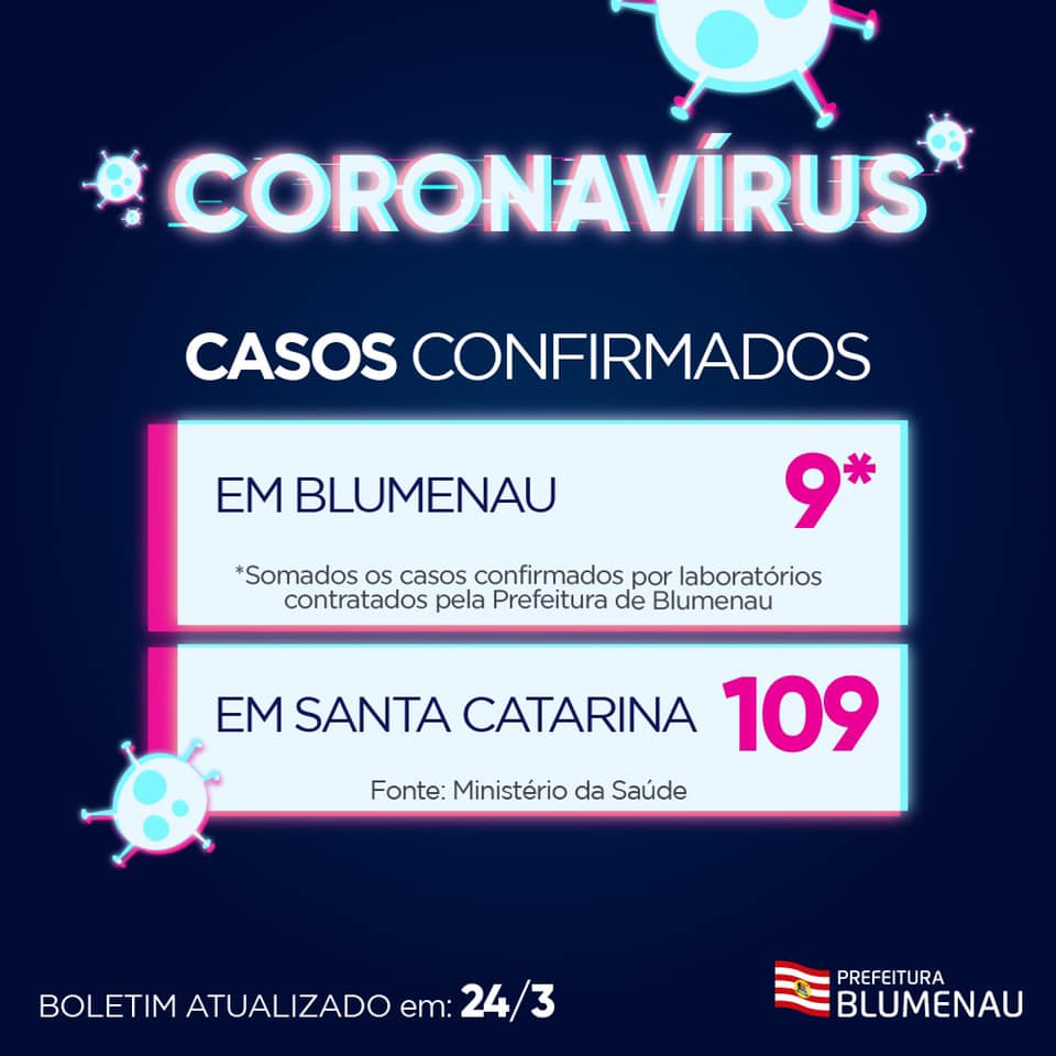 Blumenau manteve nesta terça-feira, 24, os nove casos já confirmados de Coronavírus (Covid-19). Todos os pacientes com testes positivos já passaram ou estão em isolamento domiciliar e com estado de saúde estável. Os familiares destes pacientes também receberam informações para garantir a prevenção. Além disso, 11 casos com avaliações clínicas e sintomas considerados suspeitos estão hospitalizados, dois deles em UTI. Todos aguardam a confirmação dos testes.