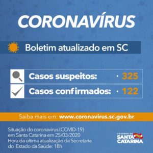 Santa Catarina tem 122 casos confirmados do novo coronavírus, conforme boletim de atualização divulgado pelo governador Carlos Moisés em coletiva de imprensa no fim da tarde desta quarta-feira, 25. Há pacientes com diagnóstico positivo para a doença Covid-19 em todas as regiões do estado.