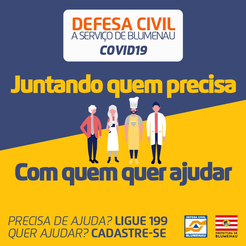 A Defesa Civil de Blumenau lançou na quarta-feira, dia 25, o projeto “Defesa Civil a serviço de Blumenau – Covid19”. A ideia é ajudar a combater os efeitos do Coronavírus (Covid-19) com a cooperação de pessoas que possam auxiliar quem faz parte do grupo de risco e que não pode sair do isolamento social.