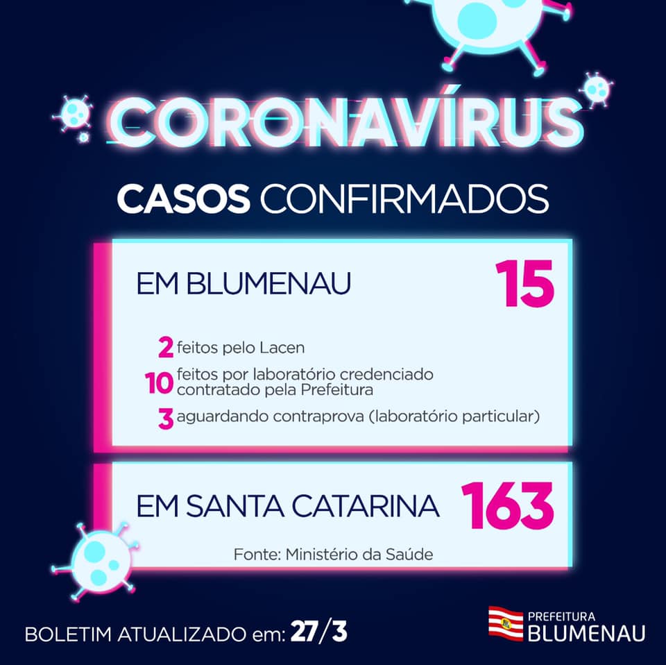 Blumenau manteve nesta sexta-feira, 15 casos confirmados de coronavírus (Covid-19). Além disso, 18 casos com avaliações clínicas e sintomas considerados suspeitos aguardam a confirmação dos testes laboratoriais.