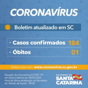 Santa Catarina tem 184 casos confirmados e uma morte por Covid-19, conforme boletim divulgado pelo Governo do Estado. Brusque, Urussanga, Papanduva e São Francisco do Sul entraram para a lista de cidades com casos confirmados. O número representa um acréscimo de 12% de casos positivos em relação ao balanço divulgado na noite de sexta-feira.
