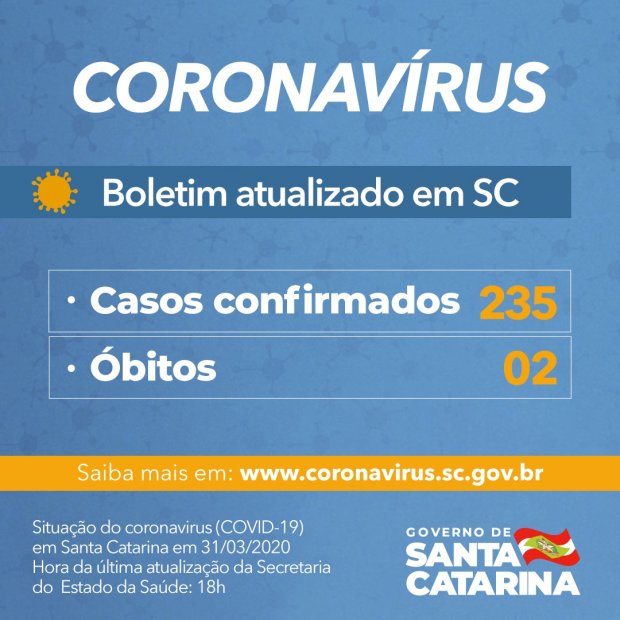 O número de pacientes com o novo coronavírus chegou a 235 em Santa Catarina nesta terça-feira, 31. O número representa um aumento de 7,3% em relação ao balanço anterior de segunda-feira. Destes, 22 pacientes estão internados em leitos de Unidade de Terapia Intensiva (UTI).
