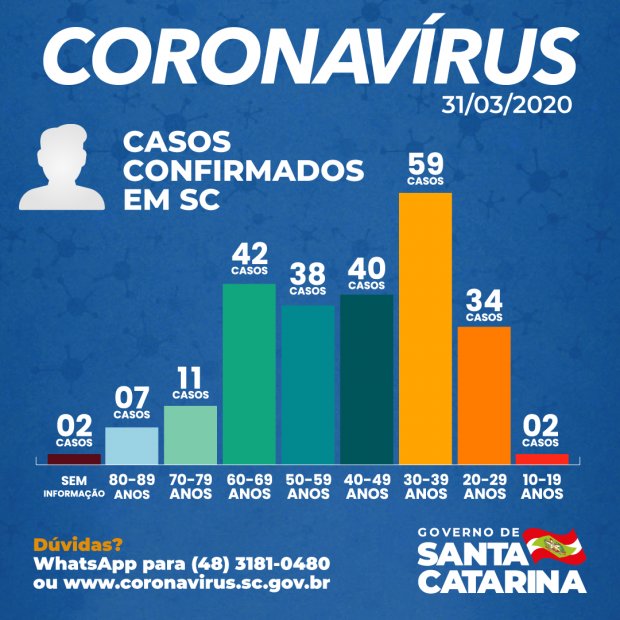 Jovens entre 20 e 29 representam 14,4% dos casos em Santa Catarina. A faixa etária entre 40 e 49 casos responde por 17%, enquanto aqueles entre 50 e 59 anos são 16,1%. Há ainda dois casos de pessoas infectadas com idades entre 10 e 19 anos, o que representa menos de 1% do total.