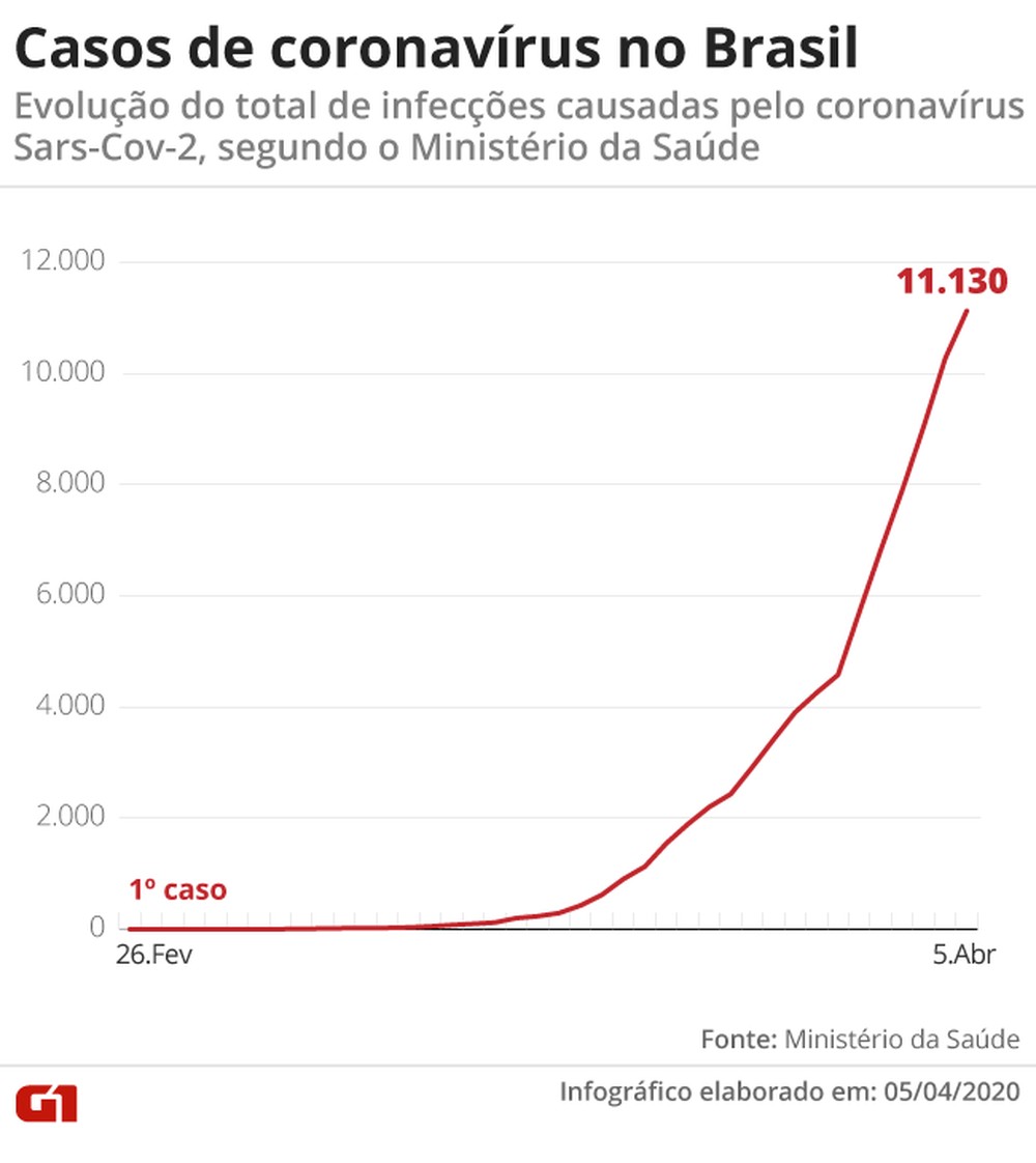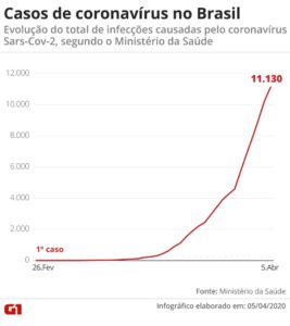 O balanço dos casos de Covid-19 divulgados pelo Ministério da Saúde neste domingo aponta 486 mortes e 11.130 casos confirmados. No sábado, eram 432 mortes e 10.278 casos confirmados. Foram 54 mortes (aumento de 12,5%) em 24 horas e 852 casos confirmados (aumento de 8,28%).