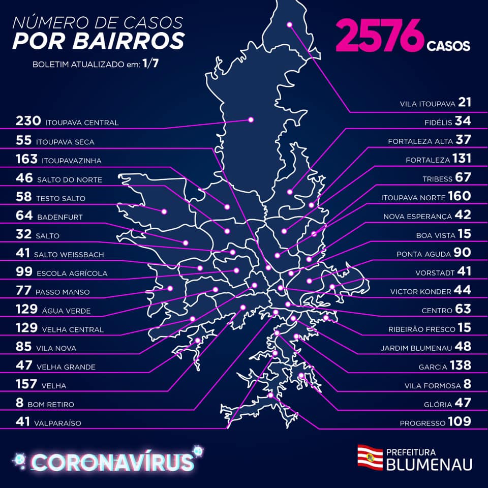 Um homem de 70 anos, testado como positivo após o falecimento, é a 11ª vítima do Covid-19 em Blumenau. O Bom Retiro soma para um morador positivado. Agora são oito no total. Mesmo assim, o bairro segue como o primeiro em número de casos, ao lado da Vila Formosa, também com oito.