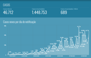 O Brasil tem 826.866 (57,1%) de pessoas recuperadas do coronavírus. Outros 561.255 ainda recebem acompanhamento médico ou estão em isolamento domiciliar. No acumulado, incluindo as vítimas fatais, são 1.448.753 de brasileiros com a doença, sendo 46.712 registrados nas últimas 24 horas.