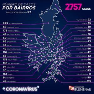 Com 1.530 (55%) blumenauenses já curados, somou nesta sexta-feira mais 97 pessoas positivadas, fechando com 2.757 casos, entre os recuperados, em hospitais, em isolamento domiciliar e óbitos.