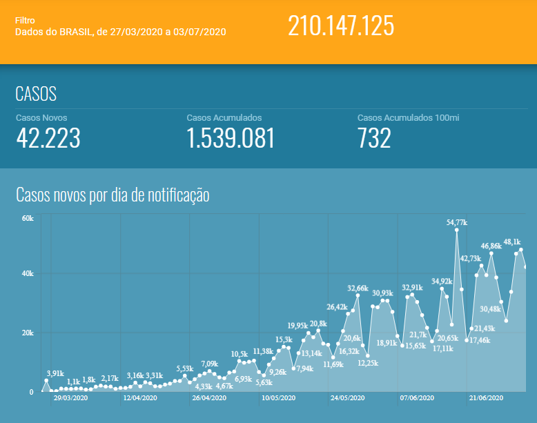 O Ministério da Saúde registrou nesta sexta-feira, 868.372 (56,4%) de pessoas curadas do coronavírus. O número é superior ao de brasileiros ainda em recuperação, com acompanhamento médico ou isolamento domiciliar –607.535. Os casos acumulados desde o início da pandemia somam 1.539.081, entre os ainda recuperação, já curados e óbitos. Nas últimas 24 horas, o país teve 42.223 confirmados nas últimas 24 horas.