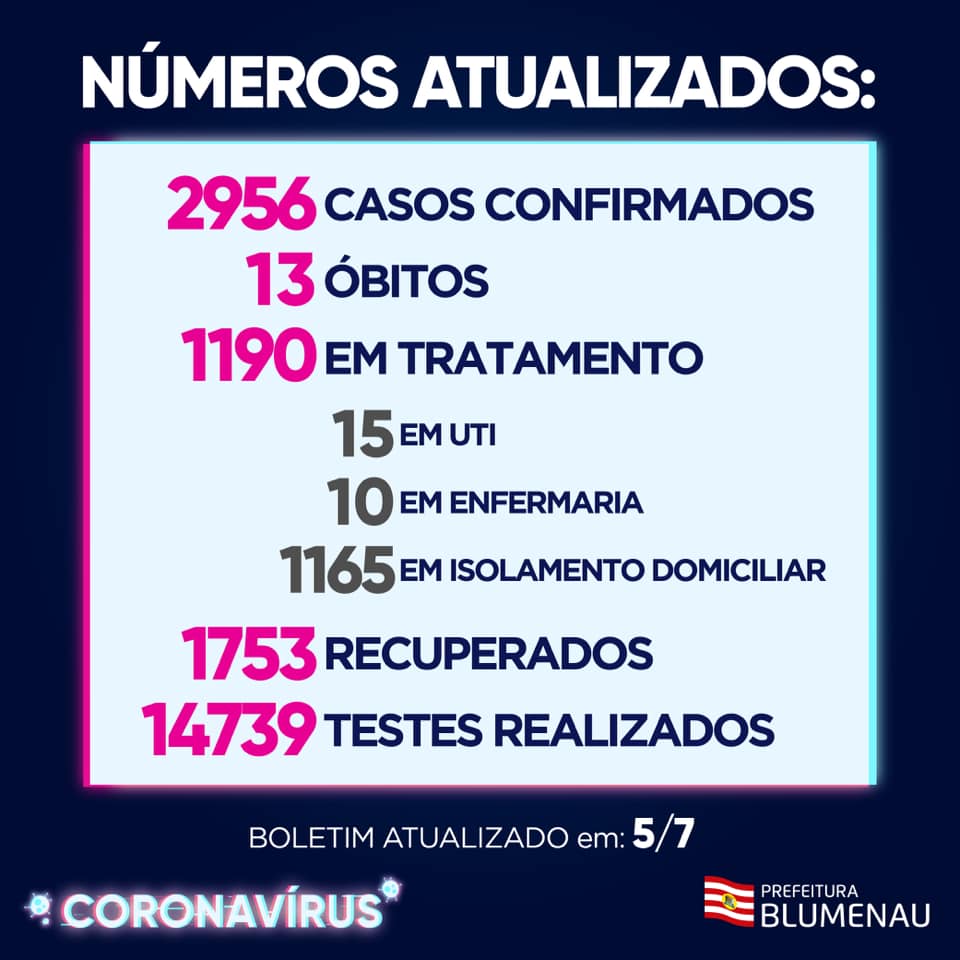 Blumenau registrou neste domingo, o 13º óbito por coronavírus. A vítima foi uma mulher de 68 anos, portadora de comorbidades. Ela estava internada desde o dia 29 de junho num hospital da cidade.