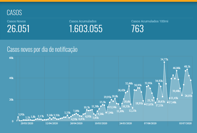 O Brasil, segundo o boletim do Ministério da Saúde divulgado neste domingo, tem 906.286 (56,5%) pessoas curadas do coronavírus. O número ainda em tratamento ou isolamento domiciliar é de 631.902 brasileiros. No acumulado, somando esses casos, mais os óbitos, o pais tem 1.603.055 que contraíram o vírus — 26.051 registrados nas últimas 24 horas.