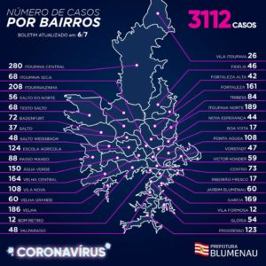 Blumenau registrou nesta segunda-feira, o 14º óbito por coronavírus (Covid-19). A vítima foi um homem de 73 anos, portador de comorbidades, que estava internado desde o dia 27 de junho num hospital da cidade. Hoje, a cidade soma 3.112 casos confirmados desde o início da pandemia. Foram 156 pessoas a mais nesta segunda-feira.