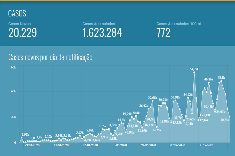 Em relação aos óbitos, atualmente, o Brasil tem no acumulado 65.487 mortes. Nas últimas 24 horas, foram mais 620 mortes nos sistemas oficiais do Governo do Brasil. A maior parte aconteceu em outros períodos, mas tiveram conclusão das investigações com confirmações das causas por Covid-19 apenas neste período. Do total, 230 óbitos foram confirmados nos últimos três dias e outros 4.146 seguem em investigação.