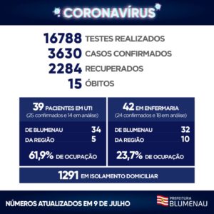 Blumenau registrou nesta quinta-feira, mais 158 casos positivados, ampliando para 3.630 casos confirmados de Coronavírus (Covid-19). Mas deste total, 2.284 (63%) estão recuperadas. Temos ainda 1.291 blumenauenses em isolamento domiciliar e 15 óbitos.
