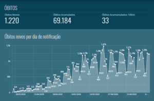 Em relação aos óbitos, o Brasil possui 69.184 mortes por coronavírus. Nas últimas 24 horas, foram mais 1.220 mortes nos sistemas oficiais. A maior parte aconteceu em outros períodos, mas tiveram conclusão das investigações, com confirmações das causas por Covid-19, apenas neste período. Assim, 342 óbitos, de fato, ocorreram nos últimos três dias. Outros 4.077 seguem em investigação.