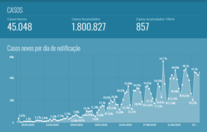 O Brasil soma 1.078.763 (59,9%) de pessoas recuperadas do coronavírus. Ainda temos 651.666 brasileiros sendo acompanhados em hospitais ou isolamento domiciliar. No acumulado, o país tem 1.800.827 casos confirmados da doença, somando os recuperados, em acompanhamento e óbitos. Foram mais 45.048 brasileiros com diagnóstico positivo, registrados nos sistemas nacionais na última sexta-feira.