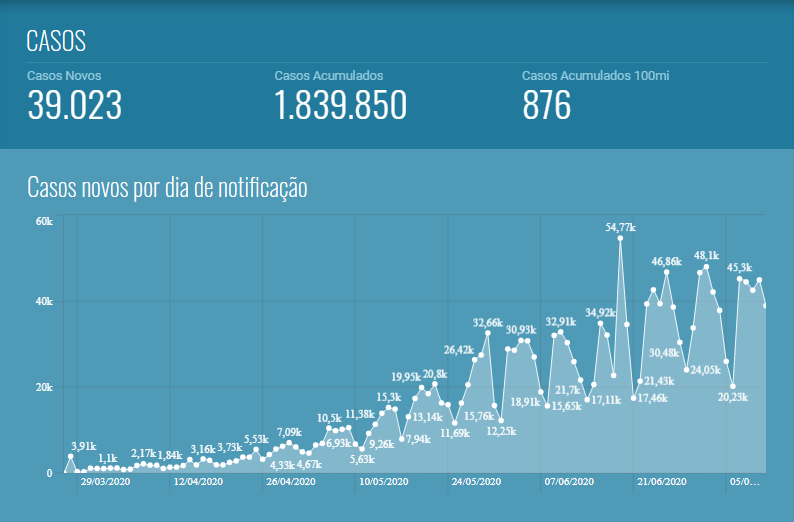 O país registrou 1.071 mortes pela Covid-19 nas últimas 24 horas, chegando ao total de 71.469 óbitos até aqui, segundo dados do Ministério da Saúde. Os casos confirmados no mesmo período somaram 39.023, com o total de 1.839.840 de brasileiros infectados pelo vírus, desde o início da pandemia. São 1.100.873 recuperados (60%).
