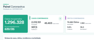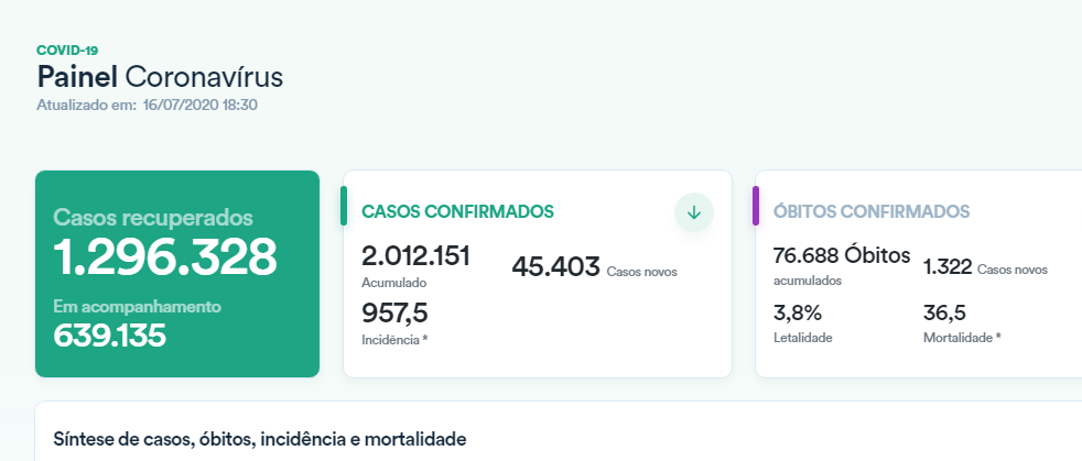 Nesta quinta-feira, o Brasil alcançou 2.012.151 casos confirmados da doença, sendo 45.403 registrados nos sistemas nacionais nas últimas 24 horas. Mas deste total, 1.296.328 (64,4%) de brasileiros estão recuperadas da doença. Outros 639.135 estão em acompanhamento médico ou isolamento domiciliar.
