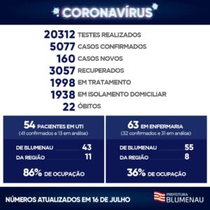 Blumenau registrou nesta quinta-feira, mais 160 pessoas confirmadas com coronavírus, totalizando 5.077 no acumulado. Os recuperados deste total chegaram a 3.057 (60%) de blumenauenses.