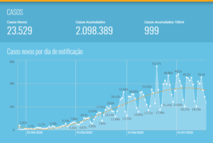 Até domingo, o Ministério da Saúde apontava 1.371.229 (65,3%) brasileiros recuperados do coronavírus. Outros 647.672 seguem em acompanhamento médico ou isolamento domiciliar. No acumulado, o Brasil tem 2.098.389 casos confirmados da doença desde o início da pandemia – 23.529 nas últimas 24 horas.