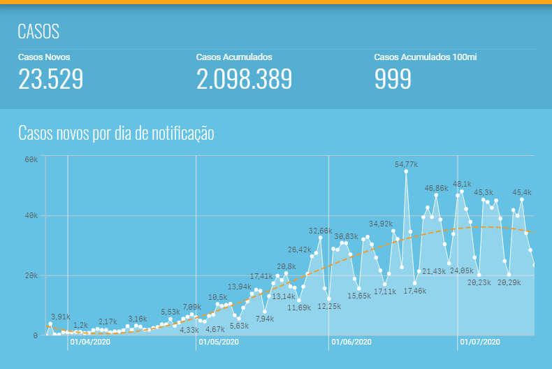 Em relação aos óbitos, o Brasil possui 79.488 mortes por coronavírus. Nas últimas 24 horas, foram registradas 716 mortes nos sistemas oficiais. A maior parte aconteceu em outros períodos, mas tiveram conclusão das investigações com confirmações das causas por Covid-19 apenas neste período. Assim, 103 óbitos, de fato, ocorreram nos últimos três dias. Outros 3.919 seguem em investigação.