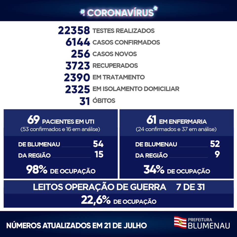 Nos hospitais da cidade, são 130 pacientes — 69 em UTI e 61 em enfermaria. A preocupação maior é com a situação nas UTIs, com 98% de ocupação nos leitos reservados para pessoas com suspeita (16) ou confirmadas (63) – 54 de Blumenau e 15 da região. Nos chamados “leitos de guerra” são sete dos 31 disponibilizados – 22,6% ocupados.