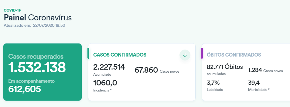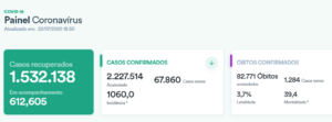 Nesta quarta-feira, o país registrou 1.532.138 (68,8%) brasileiros recuperadas do coronavírus da doença. O número de pessoas curadas é superior à quantidade de casos ativos: 612.605. São pacientes em acompanhamento médico, hospitalizados ou em isolamento domiciliar. No acumulado, são 2.227.514 casos positivados desde o início da pandemia — 67.860 nas últimas 24 horas.