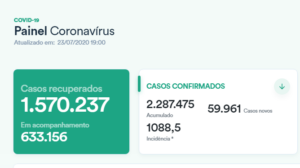Nesta quinta-feira, o Brasil registrou 1.570.237 (69,7%) de pessoas recuperadas do coronavírus. O número de ativos é 633.156. São pacientes internados ou em isolamento domiciliar. O país teve 2.287.475 de brasileiros positivados desde o início da pandemia – Mais 59.961 registrados nos sistemas nacionais nas últimas 24 horas.