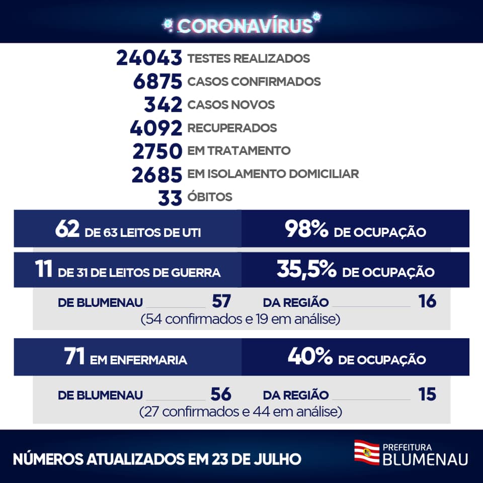 A cidade soma 6.875 positivados. Foram mais 342 pessoas nesta quinta-feira. Entre os casos positivos, 2.750 pacientes estão em tratamento. Destes, 2.685 encontram-se com estado de saúde estável, em isolamento domiciliar e sendo monitorados pela Secretaria de Saúde. Outros 4.092 (60%) blumenauenses estão curados.