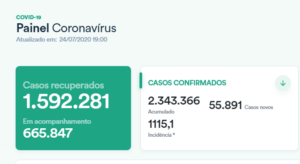 Nesta sexta-feira, o Brasil registrou 1.592.281 (67,9%) pessoas recuperadas da doença. O número de pessoas curadas é superior à quantidade de casos ativos: 655.847). São pacientes em acompanhamento médico, nos hospitais ou em isolamento domiciliar. No acumulado, desde o início da pandemia, foram 2.343.366 de brasileiros confirmados com o vírus – 55.891 nas últimas 24 horas.