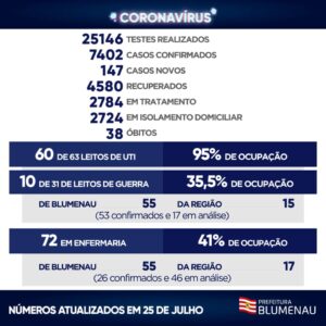Neste sábado, foram registrados mais 147 blumenauenses positivados, aumentando para 7.402 casos desde o início da pandemia. Destes, 4.580 (62%) não apresentam mais sintomas e são considerados recuperados. Outros 2.724 fazem isolamento domiciliar, monitorados pela Secretaria de Saúde.