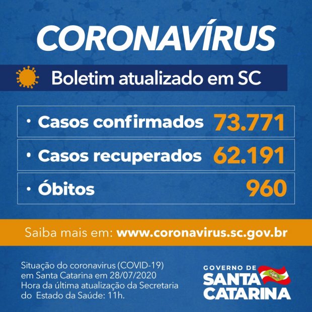 Santa Catarina conta 73.771 pacientes com teste positivo para Covid-19 desde o início da pandemia, mas 62.191 (84%) estão recuperados. Outros 10.620 permanecem em acompanhamento. Desde o início da pandemia, 960 mortes foram causadas pelo coronavírus – uma letalidade de 1,3%.