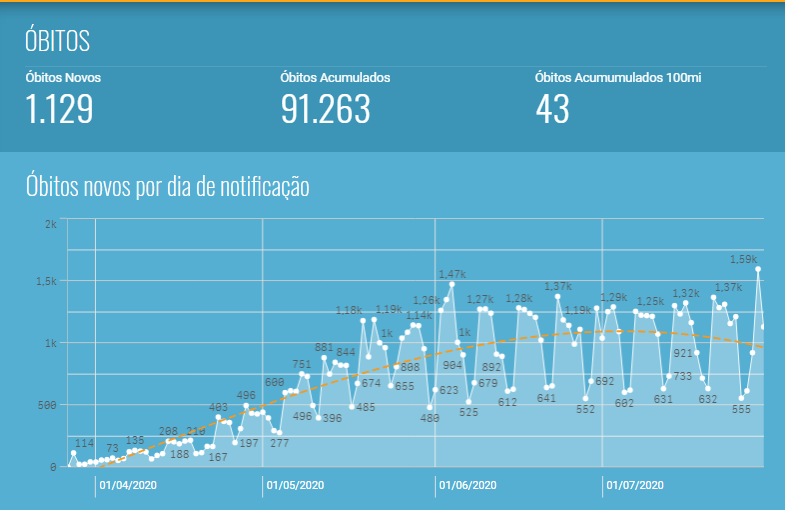 Em relação aos óbitos, o Brasil possui 91.263 mortes por coronavírus. Foram registrados 1.129 mortes nos sistemas oficiais nas últimas 24 horas. A maior parte aconteceu em outros períodos, mas tiveram conclusão das investigações com confirmações das causas por Covid-19 apenas neste período. Assim, 416 óbitos, de fato, ocorreram nos últimos três dias. Outros 3.591seguem em investigação.