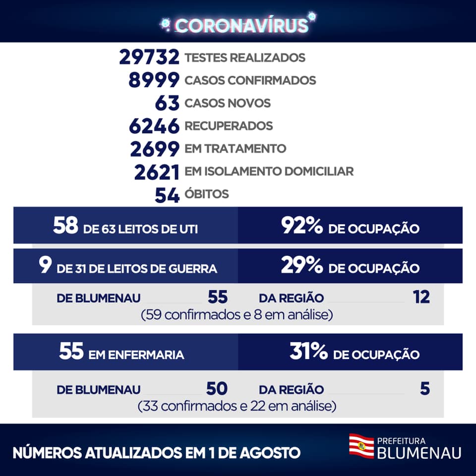 Agosto inicia com 54 óbitos acumulados em Blumenau, em decorrência do coronavírus – 41 somente no mês de julho. O último registro de óbito é de um homem de 86 anos, internado desde o dia 26 de julho. Pela manhã foram confirmadas as mortes de uma mulher de 79 anos. Ela estava desde 19 de julho. Também de um homem de 53 anos, internado desde 22 de junho. Todos em UTI.