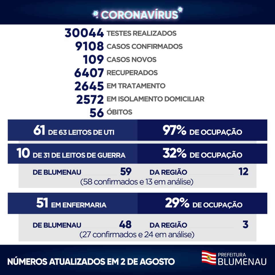 Outros 122 pacientes estão internados – 71 em Unidades de Terapias Intensivas (UTIs) e 51 em enfermaria. Em UTIs, 59 pacientes são de Blumenau (48 confirmados e 11 aguardando resultado de exame) e 12 pacientes da região (10 confirmados e dois em análise). A ocupação dos leitos exclusivos está em 97% — 61 de 63 disponíveis. Nos chamados “Leitos de Guerra”, temos 10 dos 31 ocupados (32%). Já em enfermarias, são mais 51 pessoas – 48 de Blumenau (25 confirmados e 23 em análise) e três da região (dois confirmados e um aguardando resultado). A ocupação é de 29%.