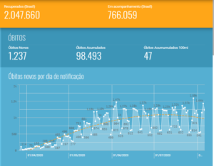 São 98.493 mortes por coronavírus no total. Nas últimas 24 horas foram mais 1.237. A maior parte aconteceu em outros períodos, mas tiveram conclusão das investigações apenas neste período. Assim, 392 óbitos, de fato, ocorreram nos últimos três dias. Outros 3.544 seguem em investigação.