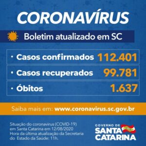 Há 112.401 casos confirmados de Covid-19 em Santa Catarina, dos quais 99.781 (89%) já estão recuperados e 10.981 permanecem em acompanhamento. O número foi divulgado na última quarta-feira. Até esta data, 1.637 óbitos foram causados pelo coronavírus. A taxa de letalidade é de 1,46%.